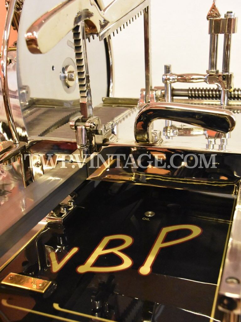 Restaurata perfettamente e con materiali di prima qualità, duraturi nel tempo e decorata in modo minuzioso sia l’affettatrice che il piedistallo.