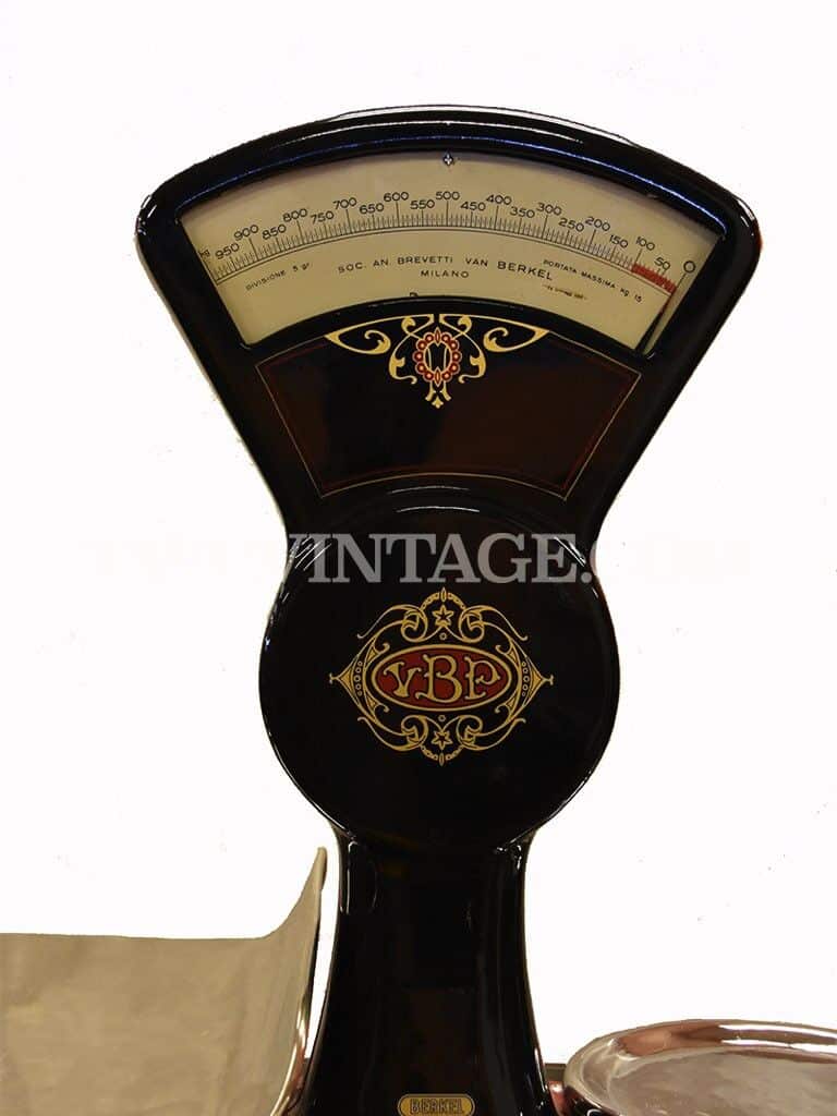Bilancia Berkel, colore nero, a due piatti in acciaio , pesata massima di 15 kg. Restaurata perfettamente in tutte le sue parti, con materiali di prima qualità.